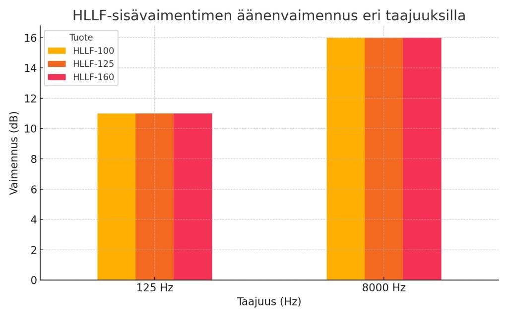 HLLF-sisävaimennin on suunniteltu vaimentamaan jo olemassa olevien ilmanvaihtokanavien kautta kulkevaa ääntä, tarjoten hiljaisemman ja miellyttävämmän sisäilman asuin- ja toimistorakennuksissa. Vaimentimessa on kolme vaimenninlevyä ja se on asennettavissa suoraan kanavaan tai 90° käyrään.